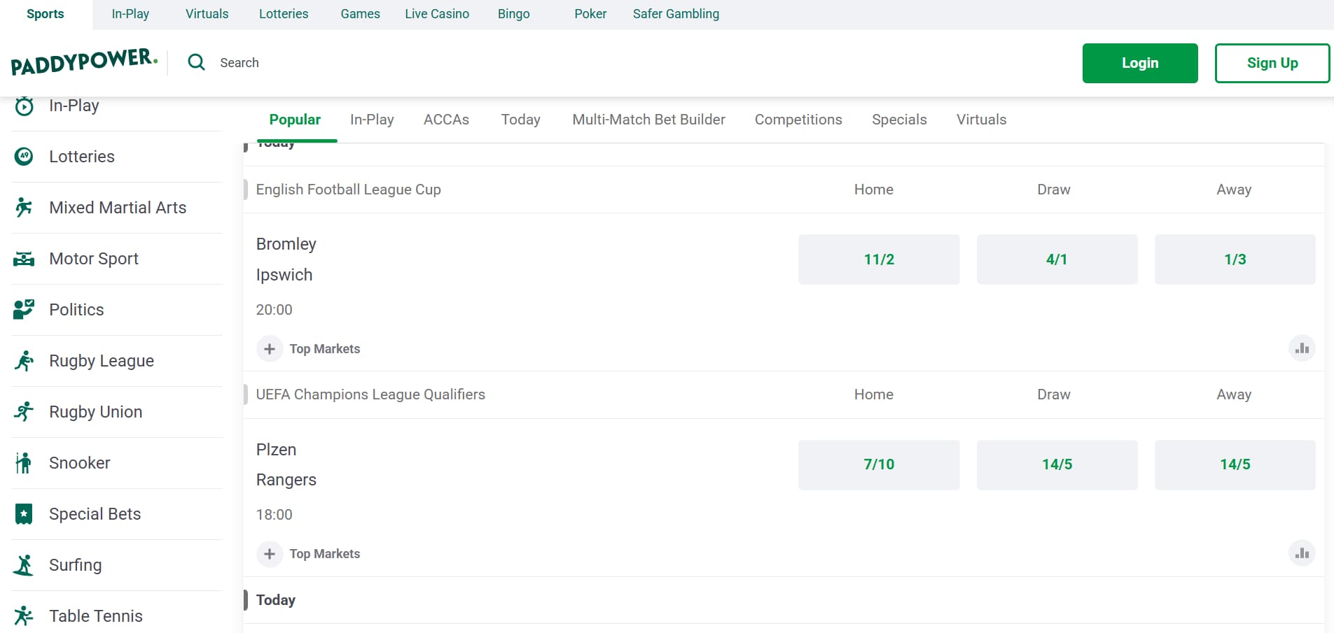 Paddy Power provides one of the most extensive sportsbooks for UK bettors, featuring strong football and horse racing coverage alongside more than 30 additional sports such as tennis, golf and darts. Major leagues and events benefit from impressive market depth, while tools like Bet Builder, Cash Out and enhanced accumulator bonuses allow bettors to tailor their wagers and boost potential winnings.